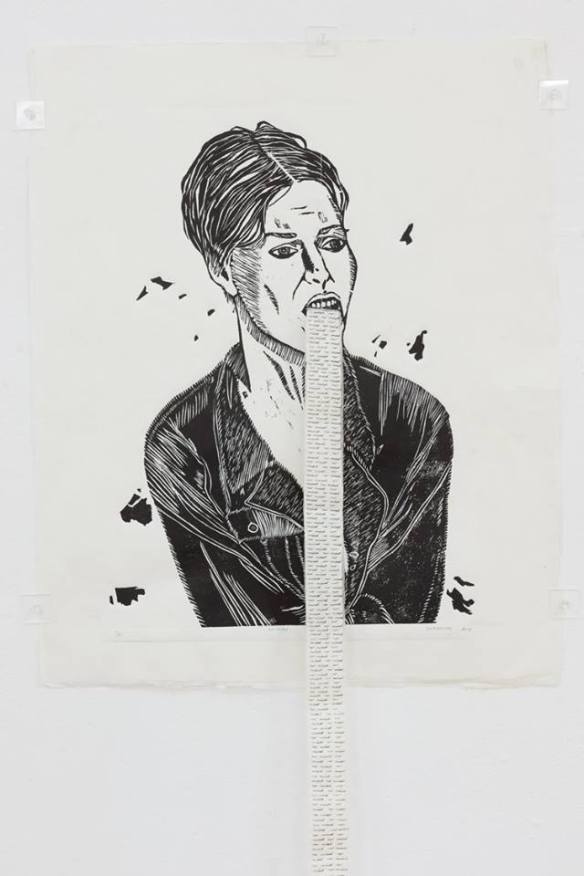LIFE WHILE YOU WANT, Installation, woodcut prints on cotton, 680 x 230 cm, 2018. Solomon Rae Gallery, YSU, Youngstown, OH, USA.