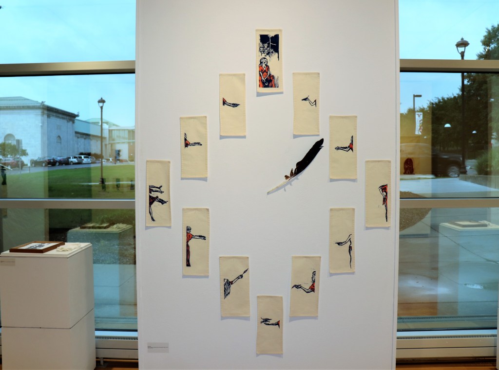 THE HOURS, Installation, woodcut prints on cotton, 114 x 230 cm, 2018. Solomon Rae Gallery, YSU, Youngstown, OH, USA.