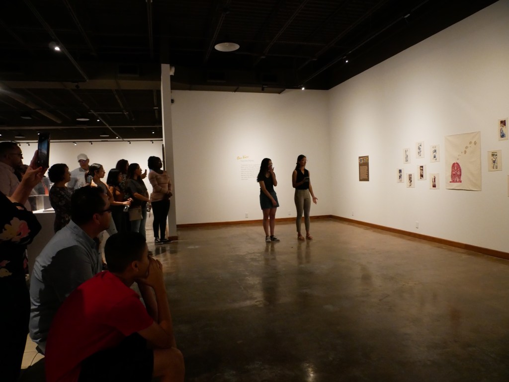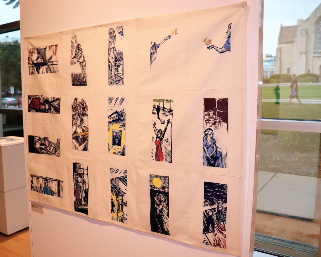 THE HOURS, Installation, woodcut prints on textile, feather. Wichita Falls Museum of Art, 2022