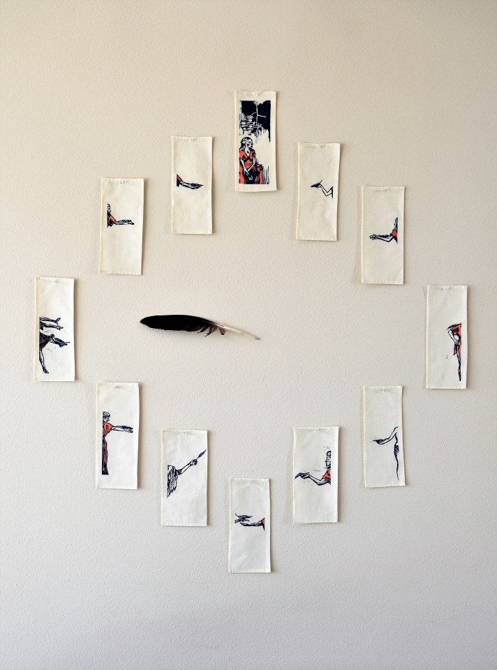 berglund_cardenas-the-hours ← Previous Next → THE HOURS, woodcut prints, cotton, stitches, feather, 2018