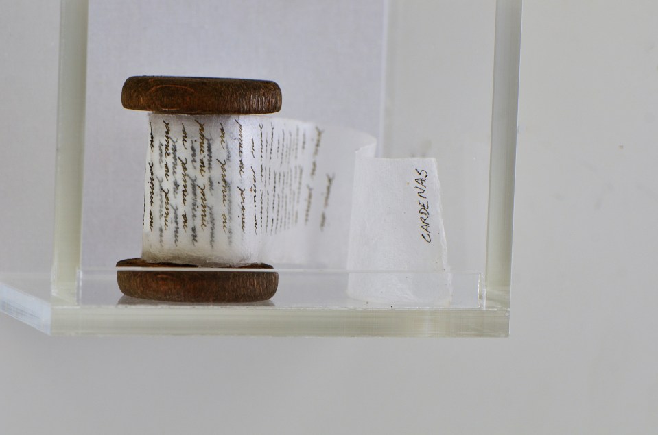 NO MIND III, Artist’s Book, handmade ink calligraphy on Nepalese paper mounted on antique sewing spool, 2014 (Part of University of Kent-Special Collections and Archives, UK)