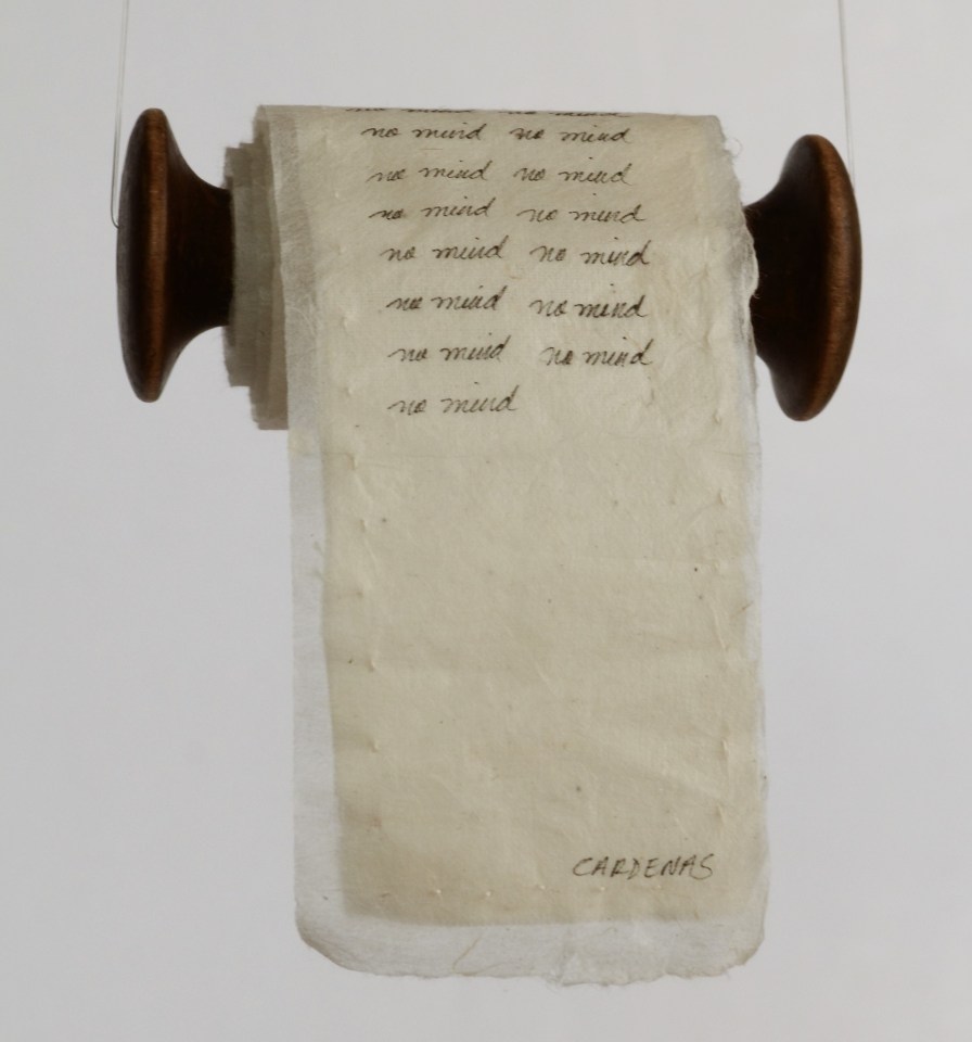 dsc_5295-cropped ← Previous Next → THOUGHTS COME AND GO, WE LET THEM, calligraphy, Nepalese paper, cotton, stitching, spool 1.6 x 4 in. (4 x 10 cm) and scroll 2.4 x 43 in. (6 x 109 cm), 2018