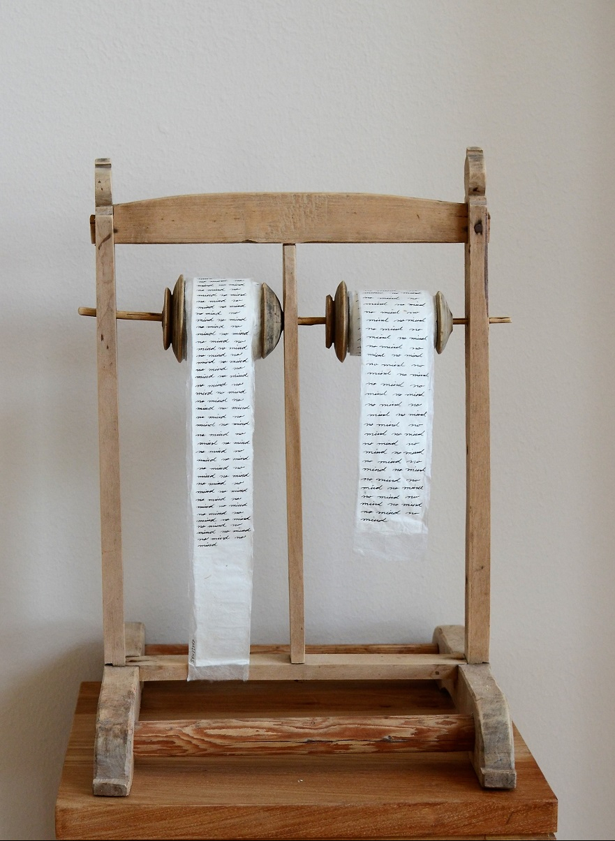 Installation consisting of Swedish antique (1800’s) wooden spool linen thread holder