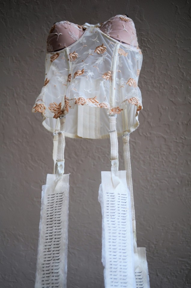 UNTITLED, Installation consisting of bridal corset and 4 ink calligraphy scroll on Nepalese paper mounted on cotton by hand-stitching, 30 x 20 x 120 cm/11.81 x 7.87 x 47 in. (w x d x l),2018
