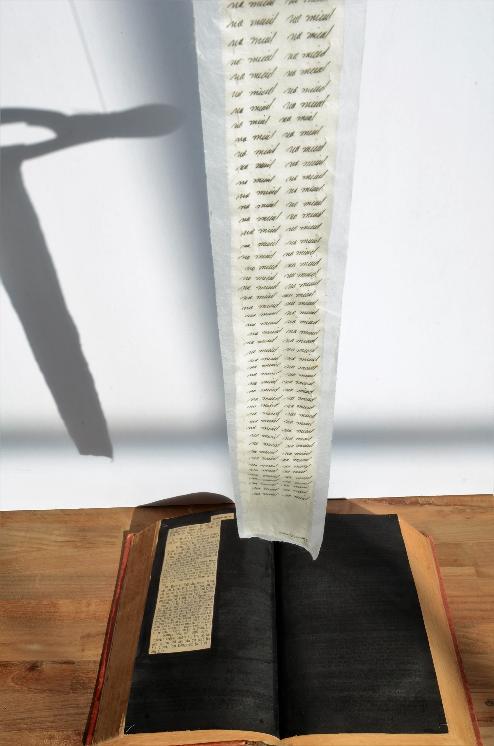Installation consisting of 2 Swedish bibles from 1890’s highlighting Deuteronomy ch.15, vs. 7-11 together with 2 scrolls of ink calligraphy on Nepalese paper, 12 x 12 x 48 in./30.5 x 30.5 x 122 cm (w x d x h), 2018