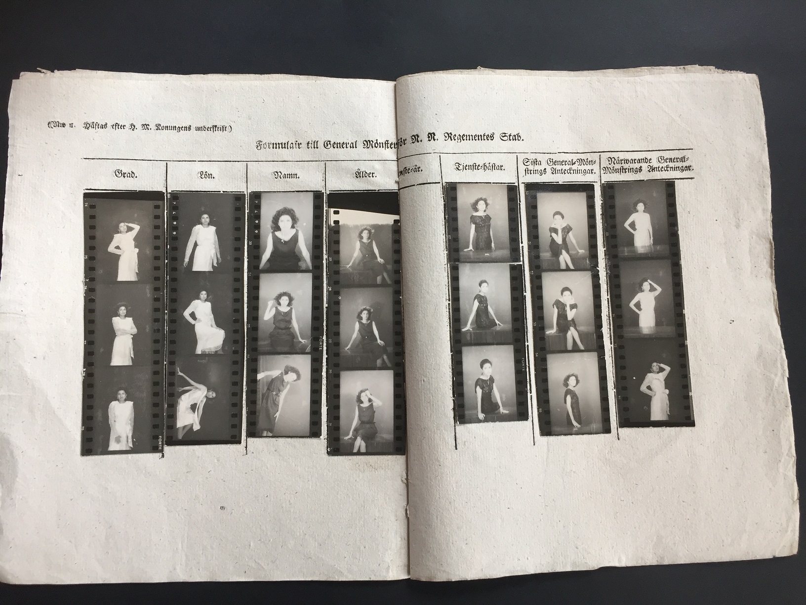 DON’T RETOUCH ANYTHING! Artist’s book, altered book, 1819’s Swedish Royal Announcements, contact prints, thread, 10 x 8 x 1 in., 2017. Part of The Digital Public Library of America.