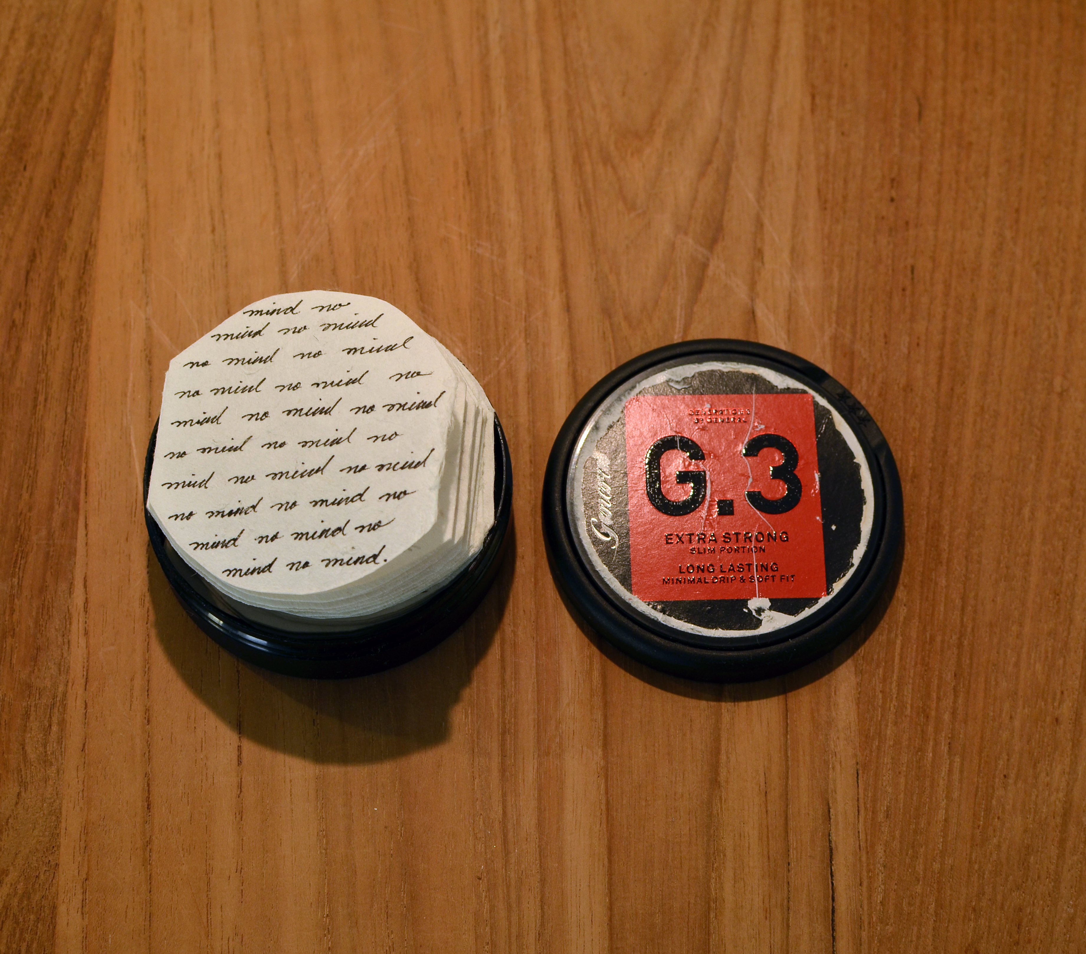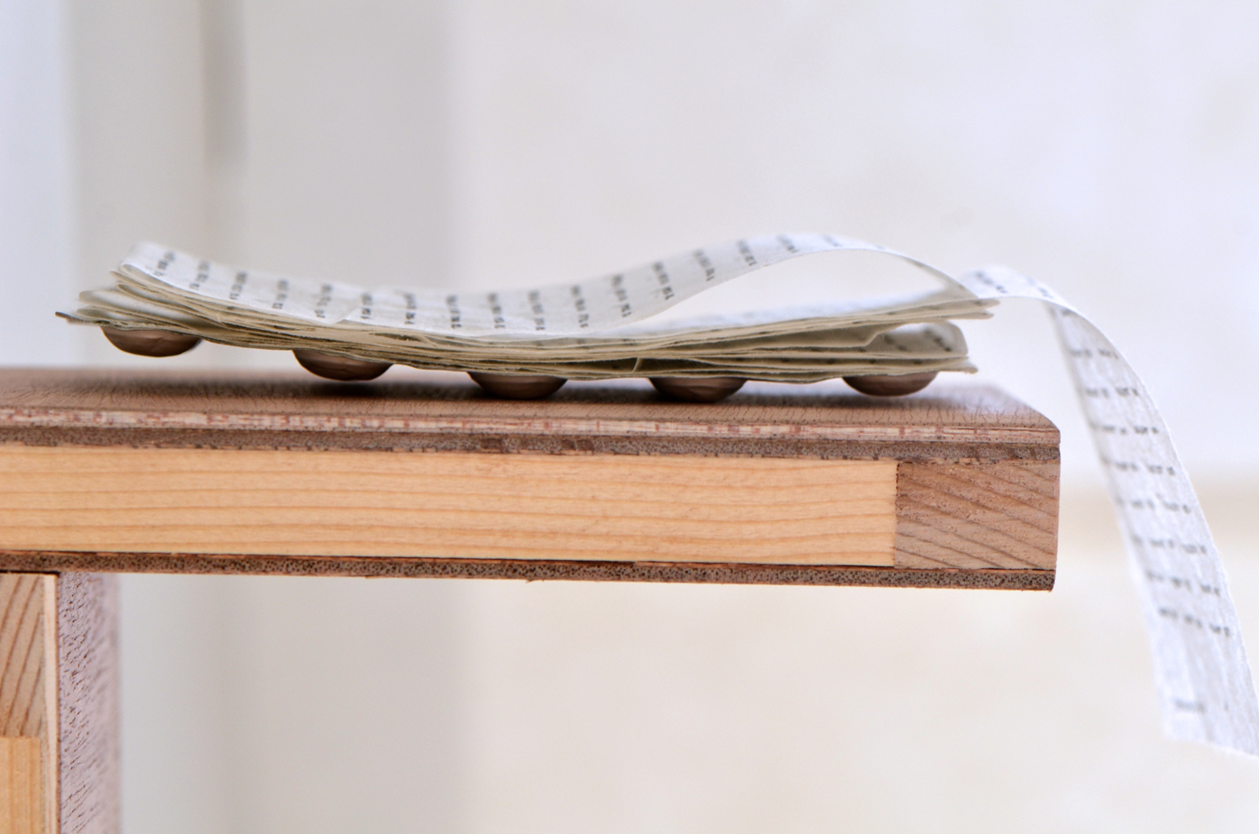 WE NEED TO TALK ABOUT PAIN! Artist’s book, chewing tobacco, calligraphy, Korean paper, diam. x ht..: 2.5 x 98 in. (6.3 x 2.4 cm), scroll’s lenght : 130 in. (330 cm), 2016