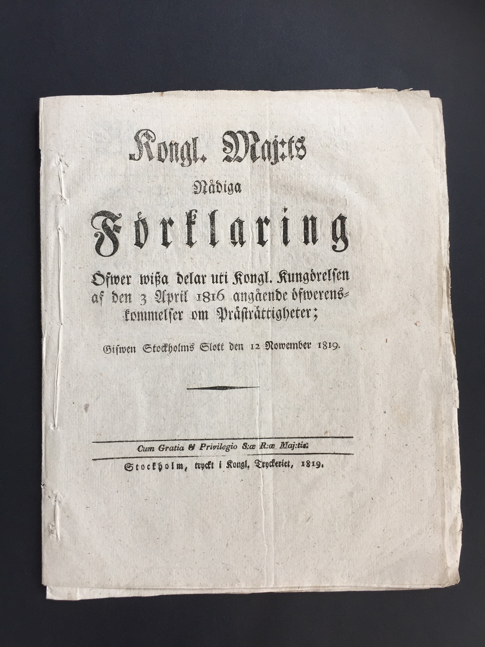 WEDDING SERIES: 1819-1998, page 1 of Artist’s book in wood box, 1819’s paper from Swedish Royal Announcements, watercolor, ink, zirconia ring, 10 x 8 x 1 in., 2017. Part of The Digital Public Library of America.