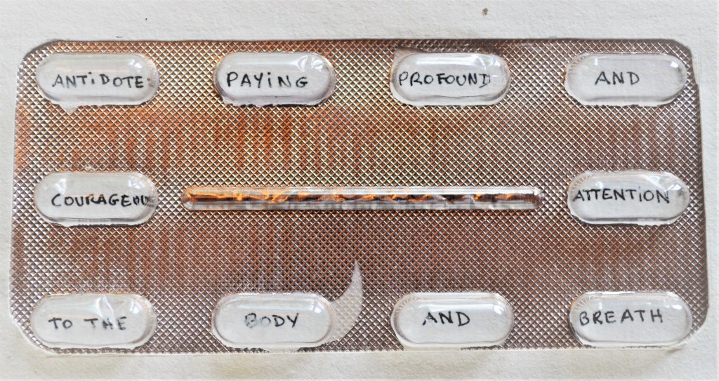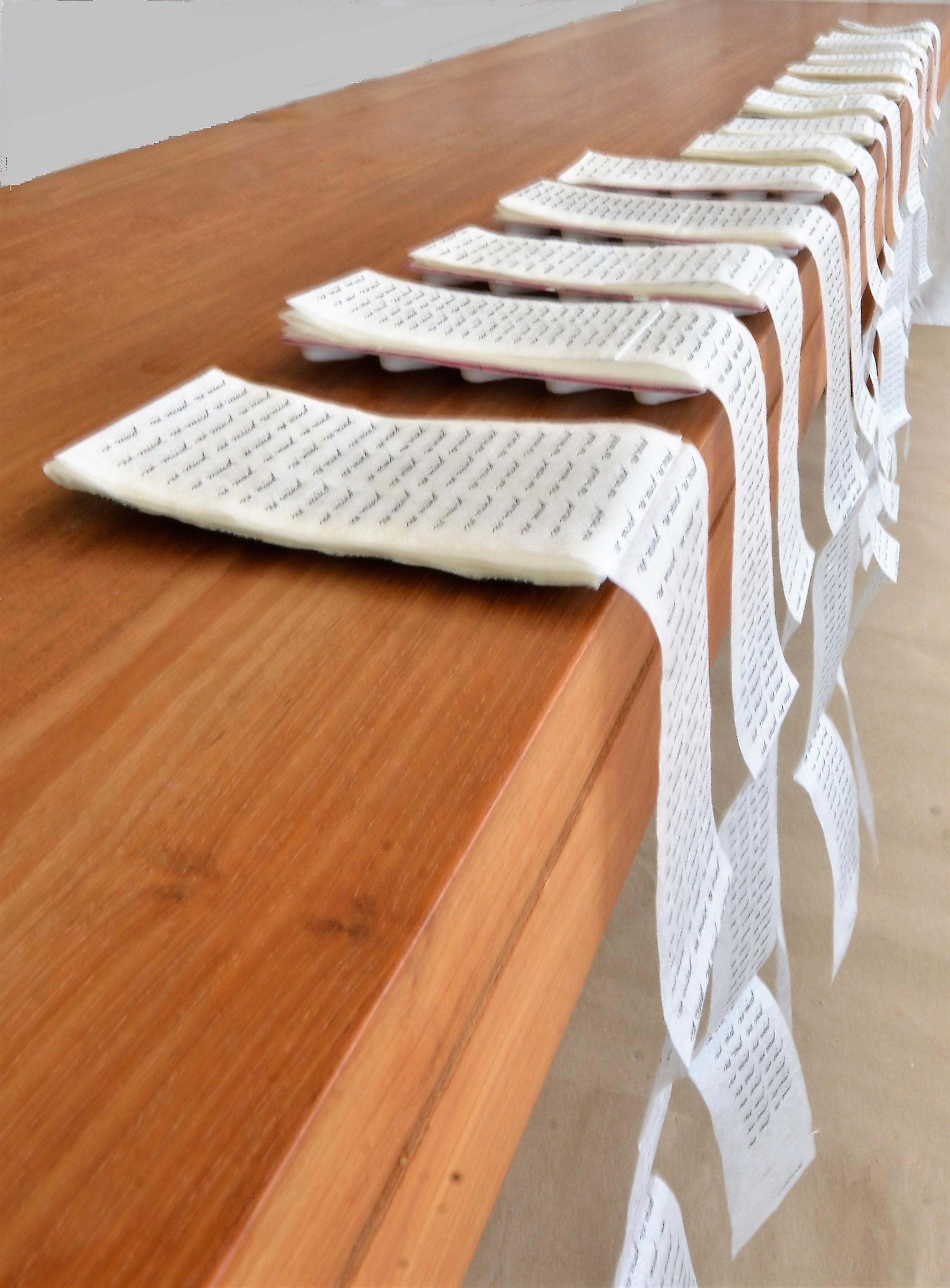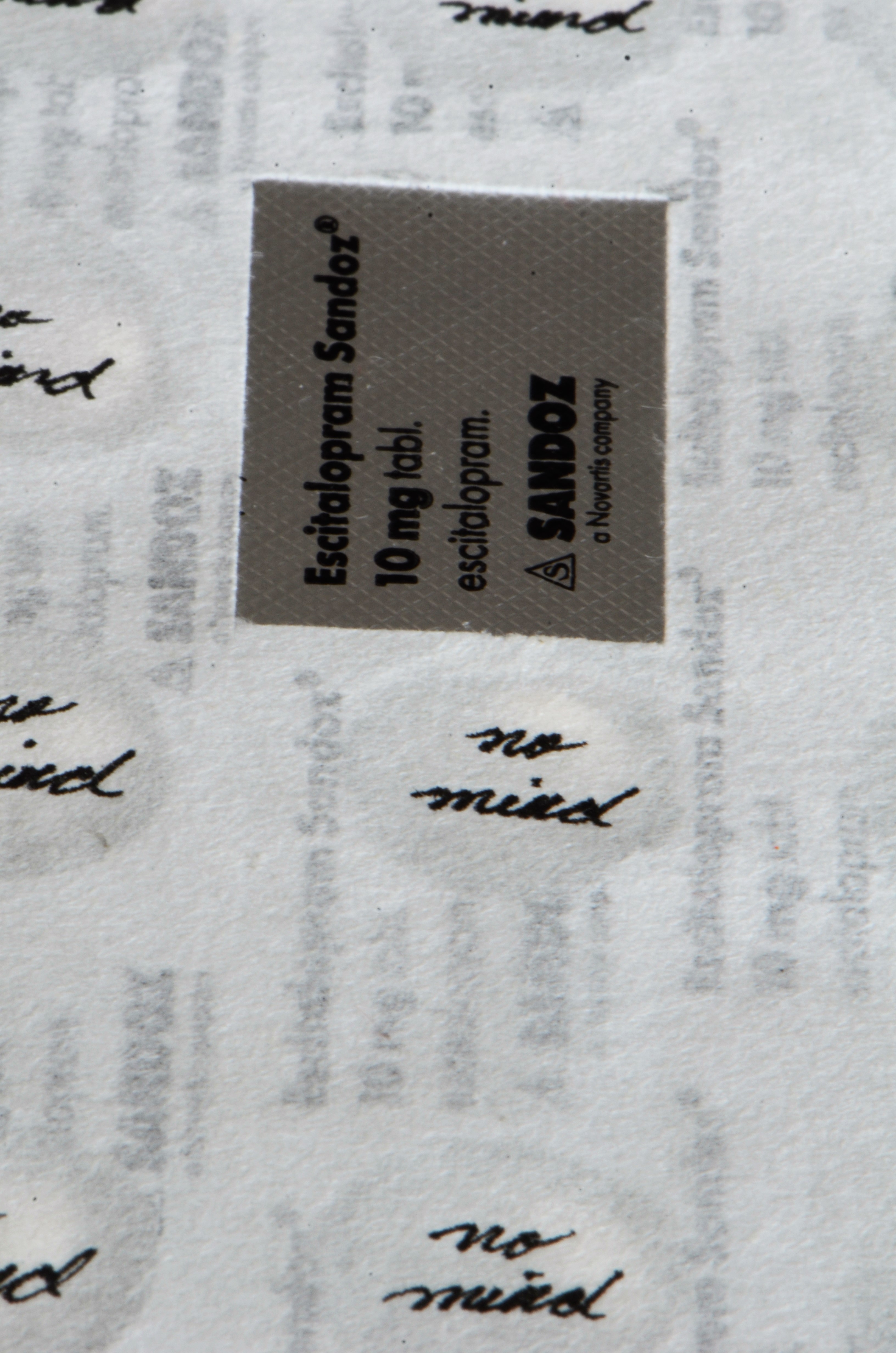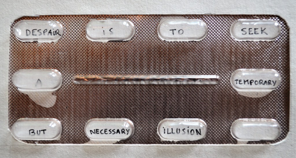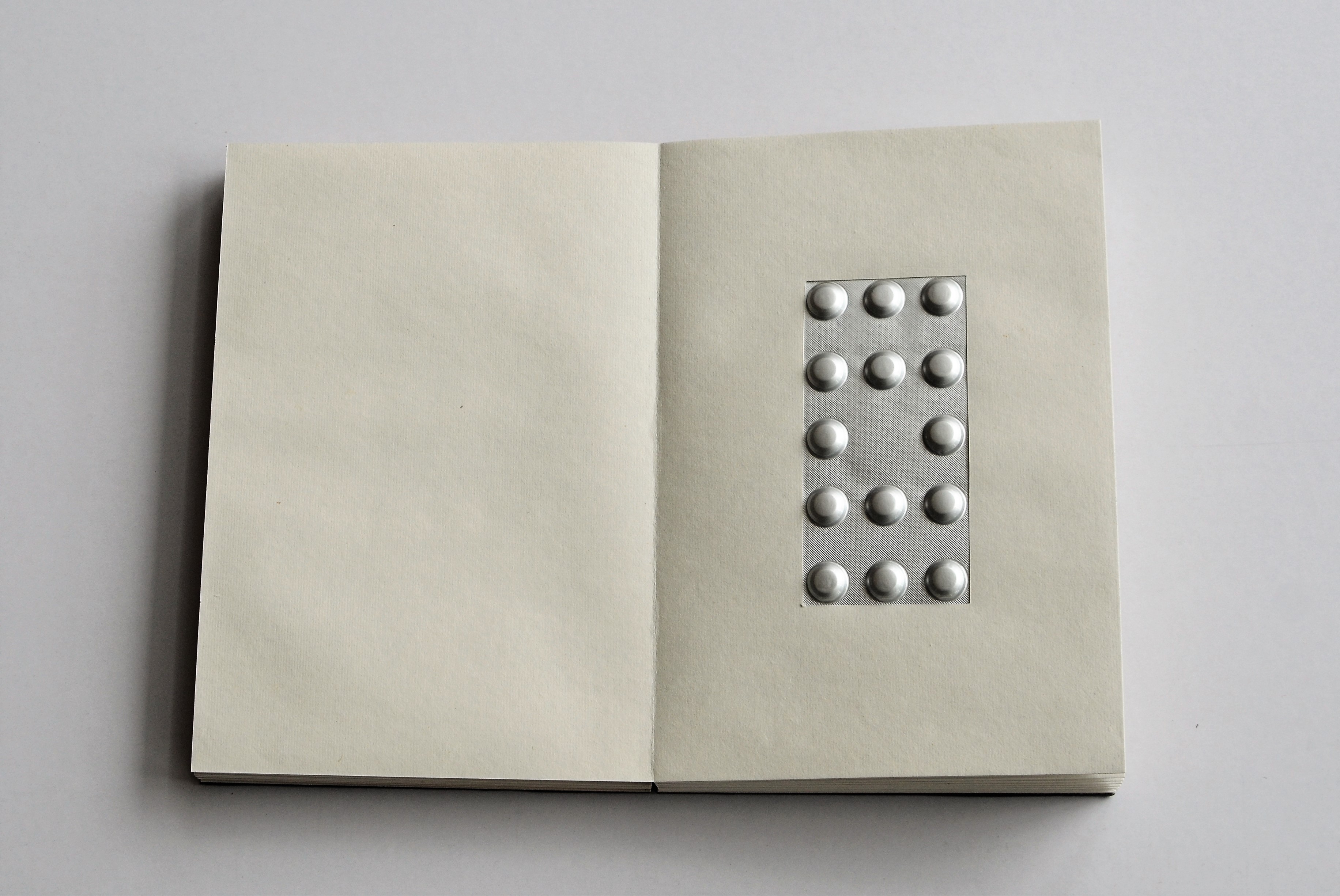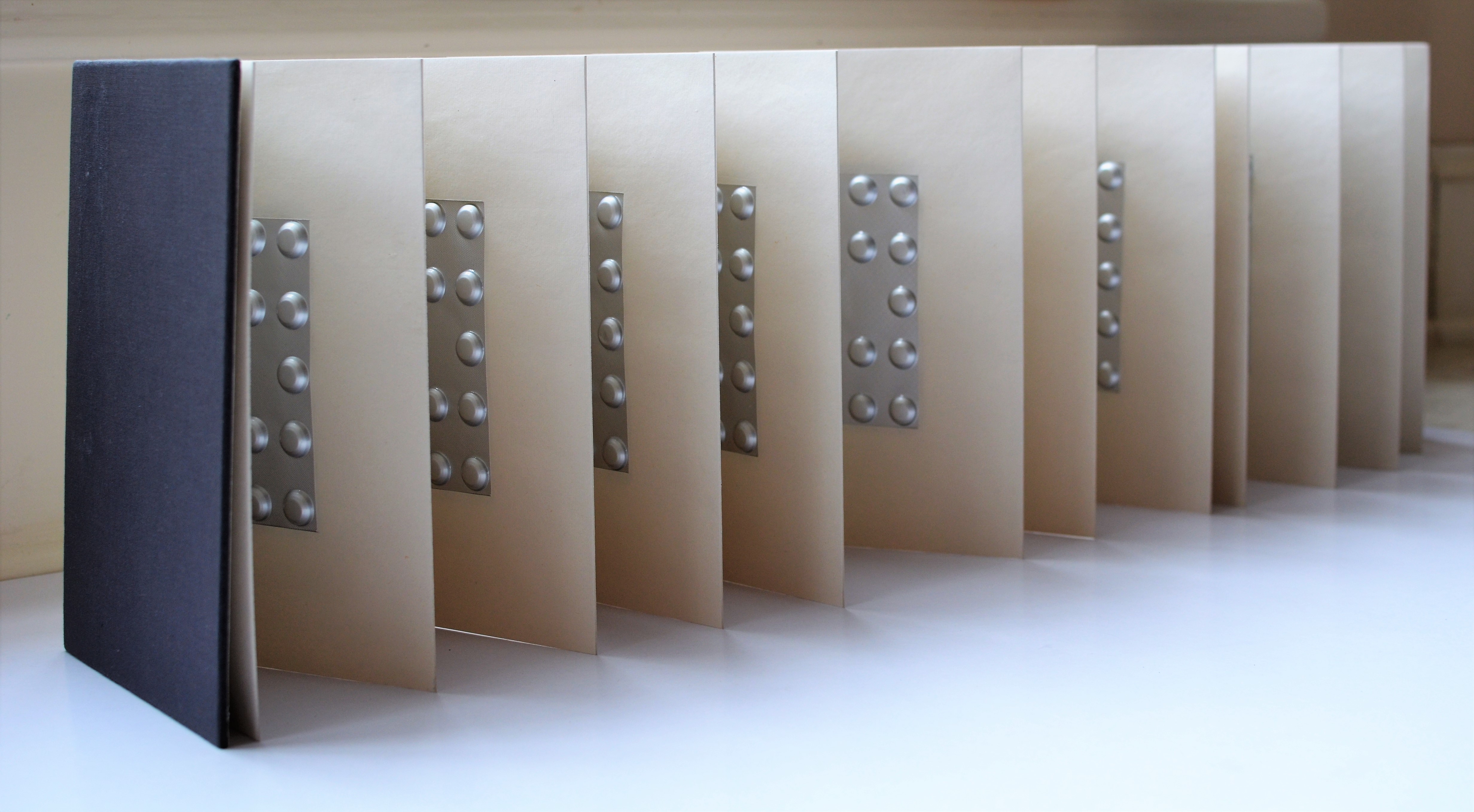 PRESCRIPTIONS II: The antidote for despair, 2021-2022 is an accordion style artist’s book exploring mental health and the culture of overmedication. Empty spaces in antidepressant tablets are filled with thoughts on Despair from Consolations by David Whyte. It is also part of a series of objects and installations using empty antidepressant strips.