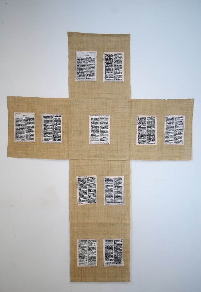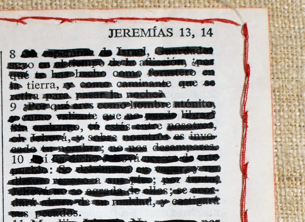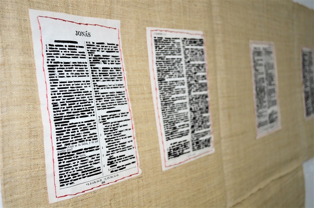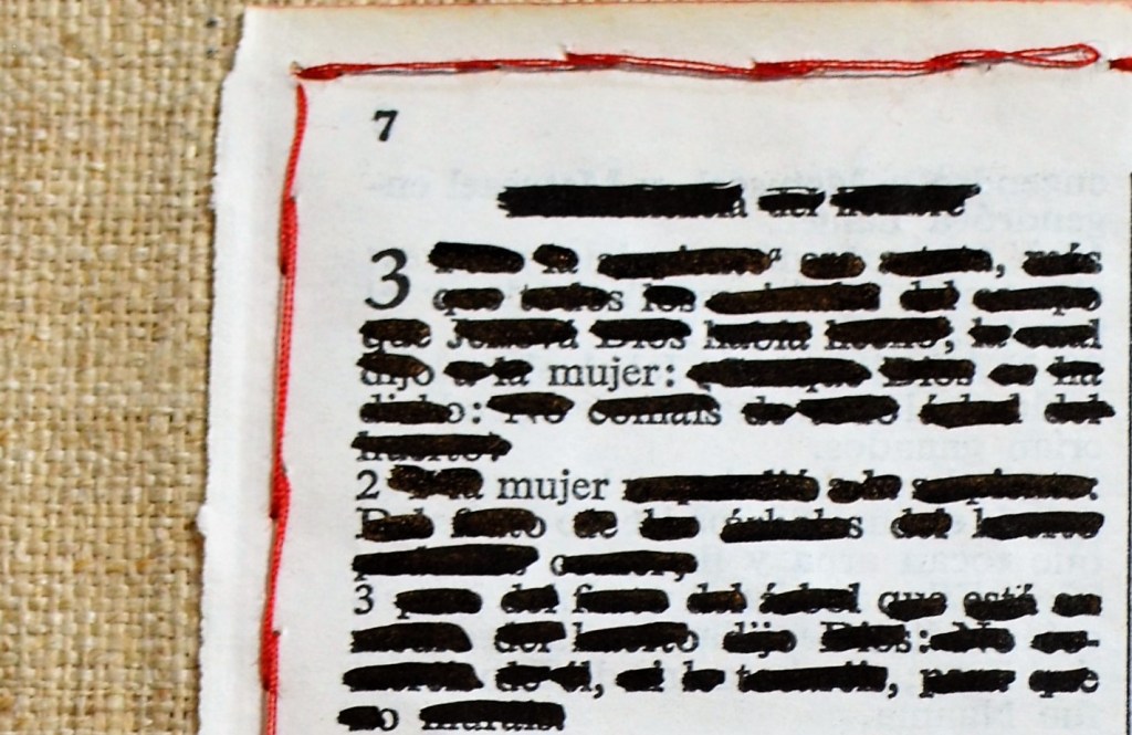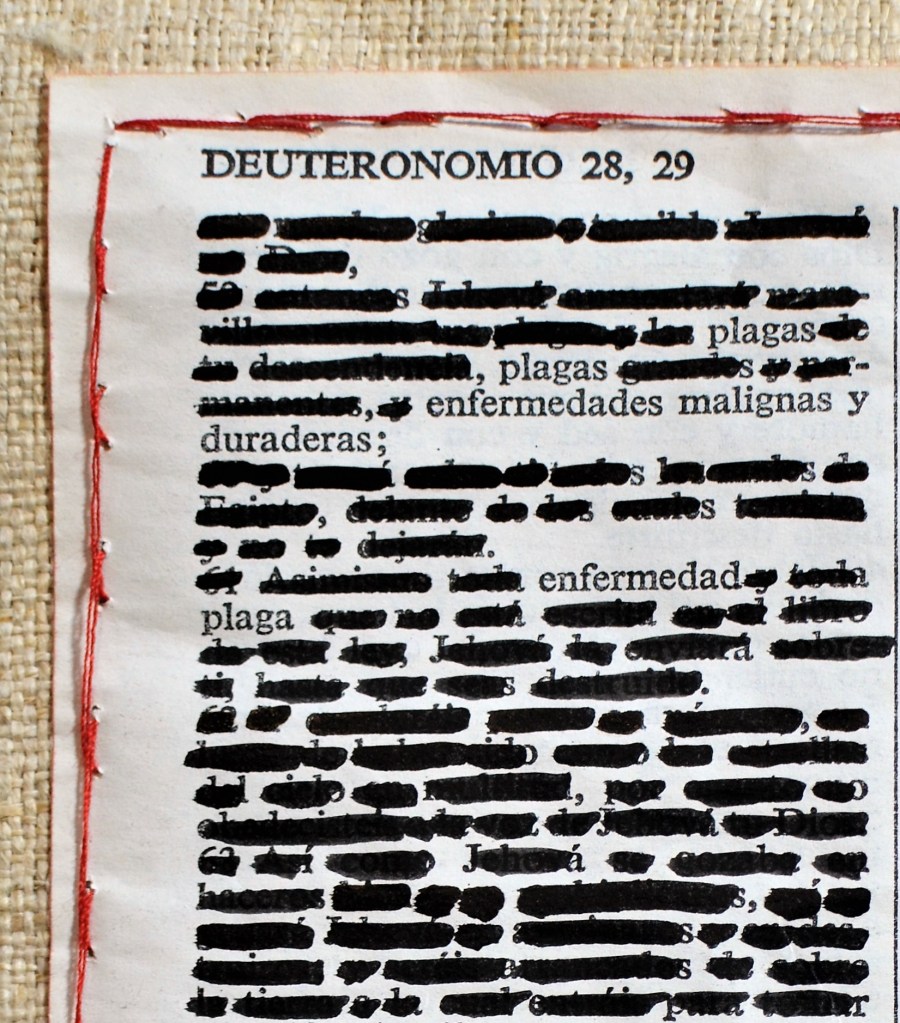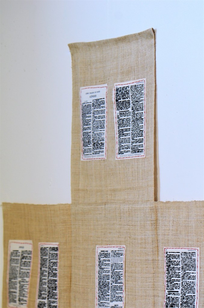 HOME, 2020 is a foldable artist’s book/installation that resonates with the global narratives of woman, earth, pandemic and loss of home. Materials include hemp, thread, India ink on altered Spanish Bible pages. The words woman/mujer, earth/tierra, hunger/hambre, plague/pestilencia, mortality/mortandad, and verses of ruin and devastation on earth/asolados has been left unredacted. The act of altering the bible suggests dichotomies of sacred and profane, East and West, lightness and weight, creating and erasing. It is also a metaphor for ephemerality, transmutation and purification, while the mindful process is an antidote for uncertainty and a constant sense of dislocation.