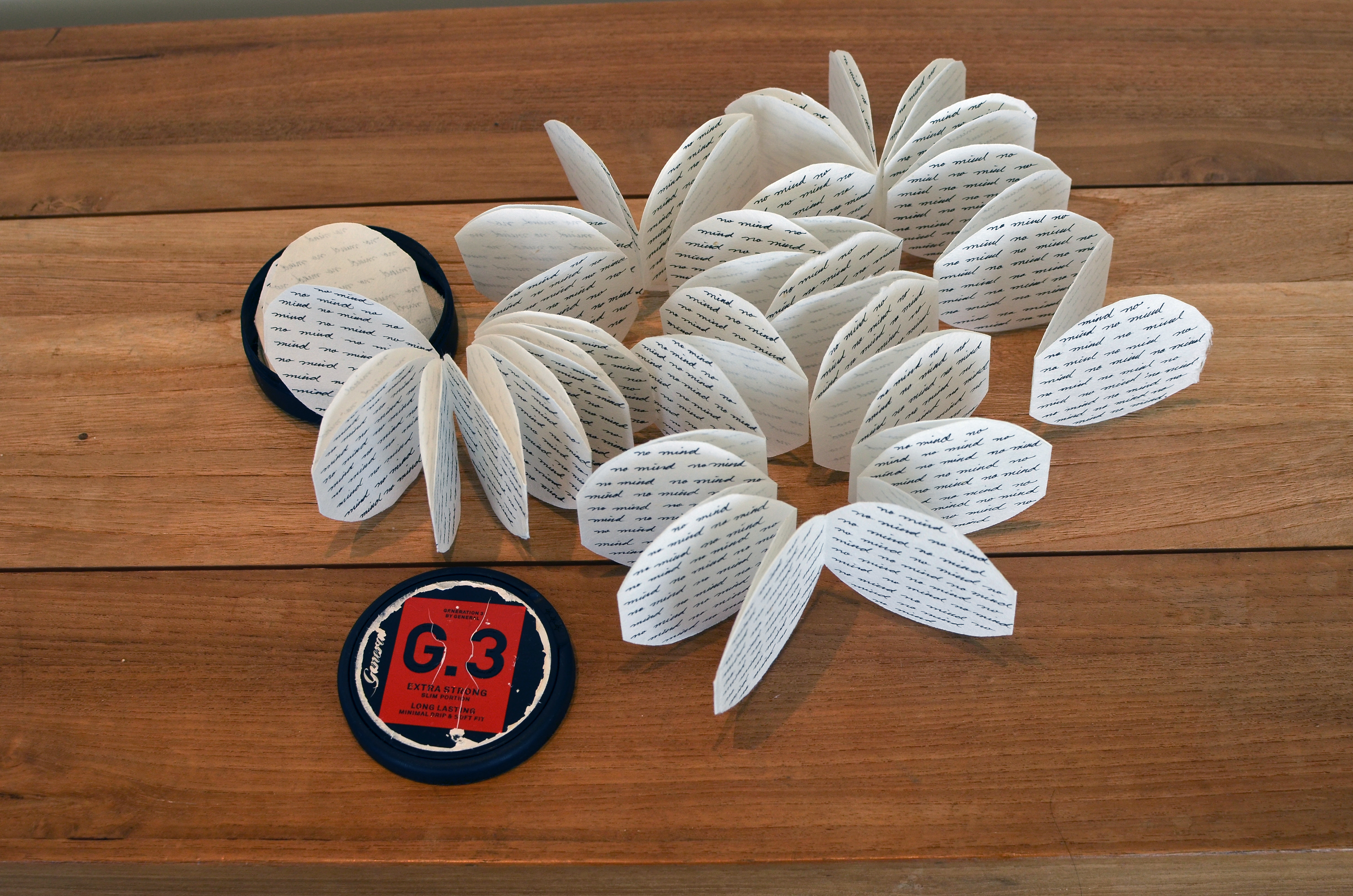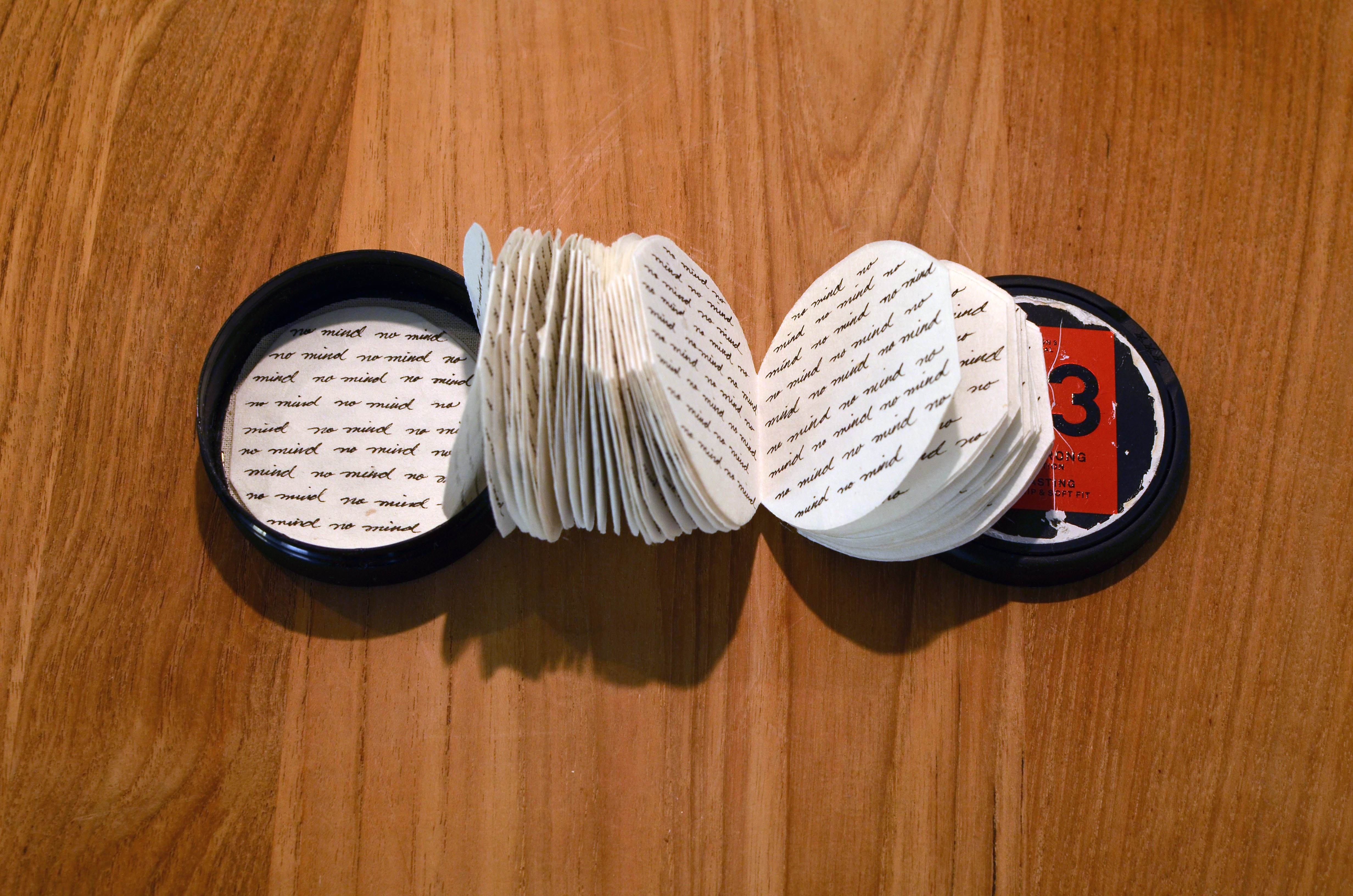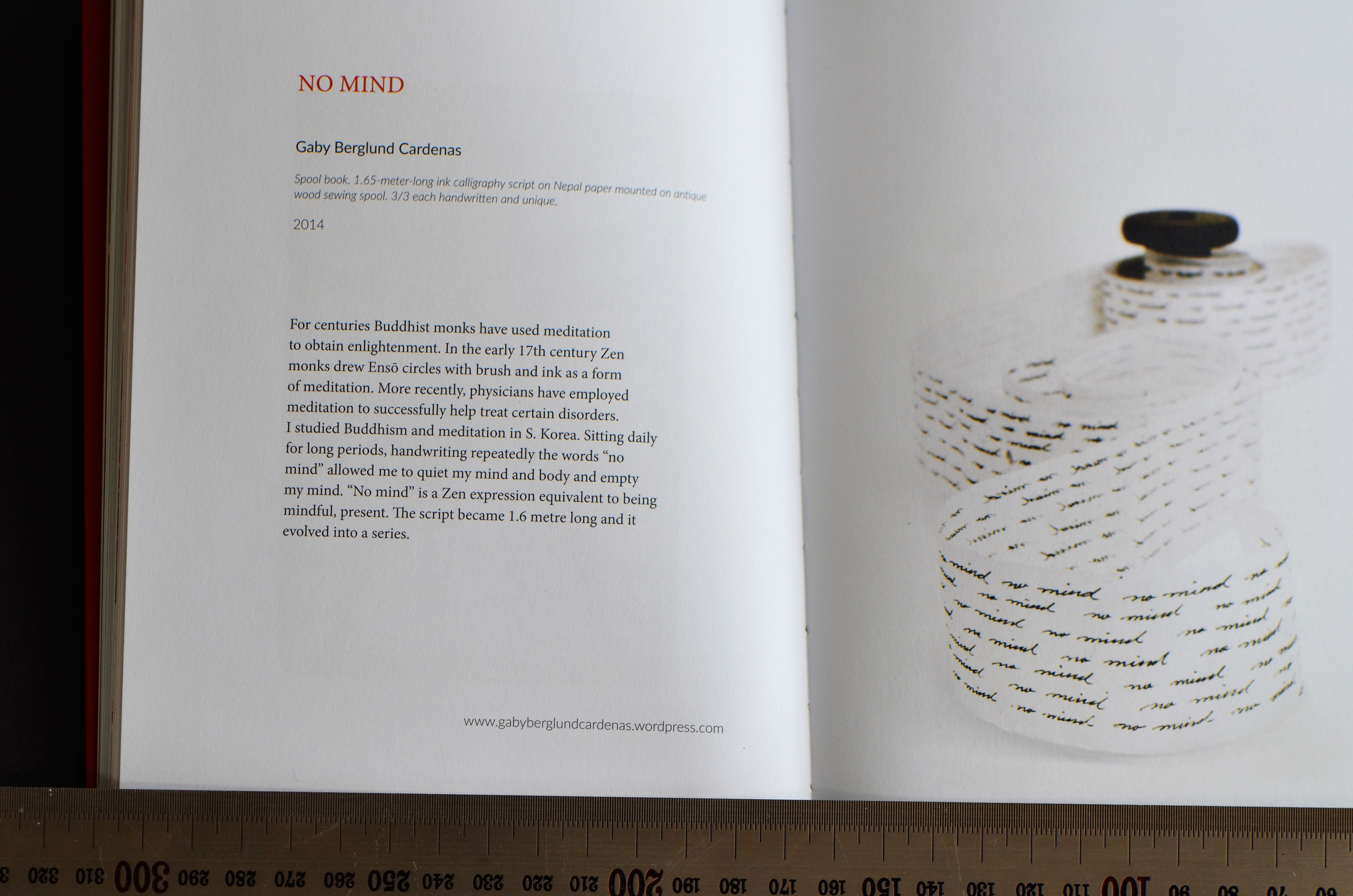 NO MIND III, Artist’s Book, handmade ink calligraphy on Nepalese paper mounted on antique sewing spool, 2014 (Part of University of Kent-Special Collections and Archives, UK)